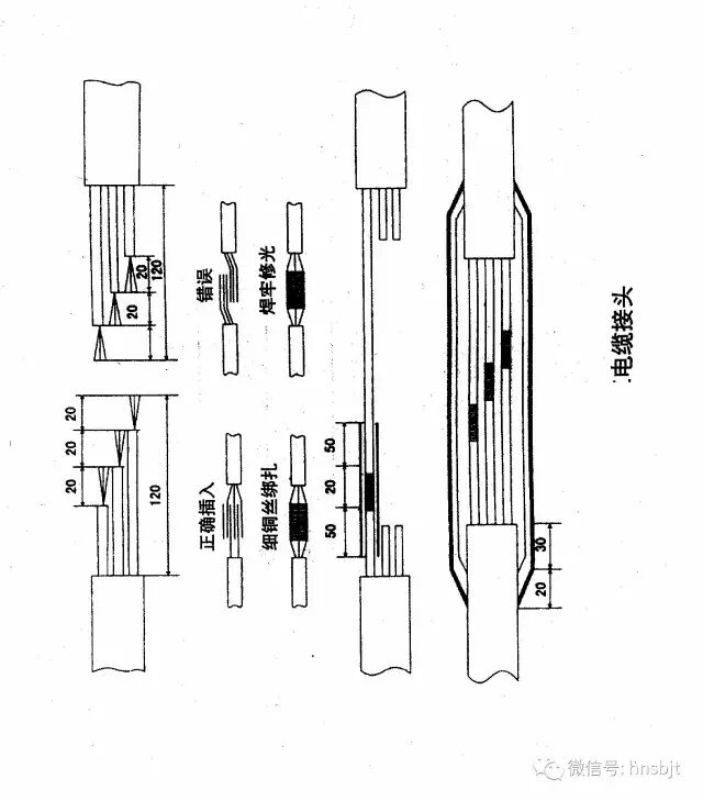 电缆接头:将引出电缆与配用电缆一端用电工刀切去120毫米橡胶套,将电缆两端叉口处分开用密封胶带进行密封,然后将三股芯线长短阶梯形错开,剥出20毫米铜芯,用刀刮或用纱布除去铜线外部的氧化层,将对接的两线头对插进去,用细铜丝绑紧后,用锡焊,焊透焊牢,表面除去毛刺,然后三个接头分别用涤纶绝缘胶带半叠式包扎3层,包扎层两端用尼龙线缠绕扎紧,再用半叠方法包扎胶带3层,外面用高压绝缘胶带包扎3层,最后将3股合拢,用高压胶带反复包扎5层,每层包扎一定要拉紧,层间接缝要严密牢固,以免水渗入破坏绝缘。包扎好后在20℃室温水浸泡12小时以上,用兆欧表测量其绝缘电阻不低于150MΩ.电缆接线工艺附图(见图)